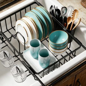 Expandable In-Sink Dish Rack – Compact Plate & Cutlery Holder (Includes Silicone Drip Tray)