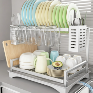 High-Capacity Double-Tier Dish Rack (Aluminum Alloy) — Includes Cutlery Holder & Drip Tray (Silver)