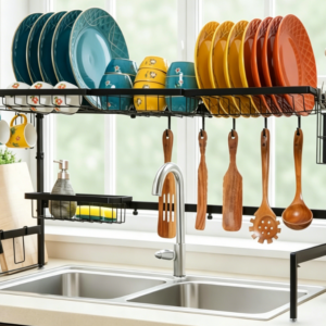 Adjustable Over-the-Sink Dish Rack – Stainless Steel Plate & Cutlery Organizer (Includes Cup Holder) (Black)