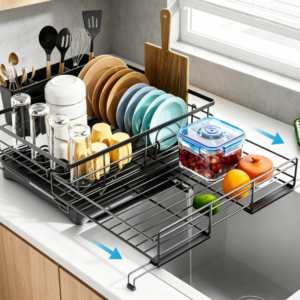 • Telescopic Stainless Steel In-Sink Dish Rack (Rust-Resistant Design) — Includes Cup Holders