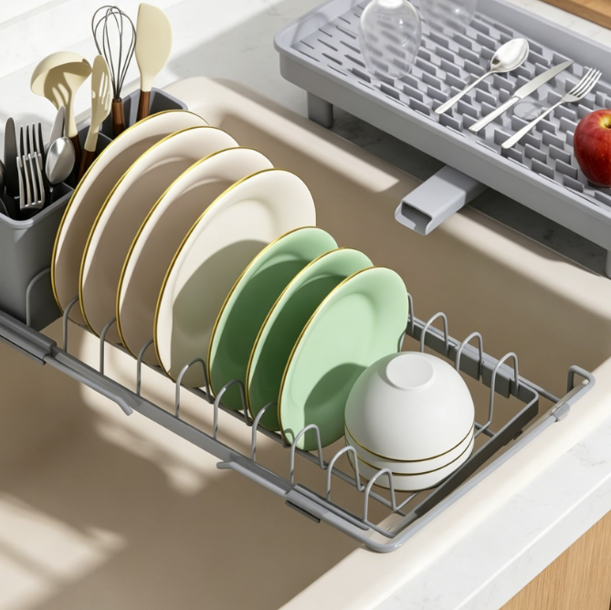 This 2-in-1 sink dish rack is perfectly suited for small kitchen spaces. It can be placed on the countertop, inside the sink, or positioned to span across the sink, and features a water-guiding tray with a rotating drainage spout that directs water directly into the sink, eliminating the need for manual emptying. Constructed from stainless steel with a non-slip base, the rack offers exceptional stability during use. It accommodates dinner plates, along with various pot lids and utensils; its compartmentalized design facilitates organized storage, making it an ideal solution for daily use in compact living spaces.