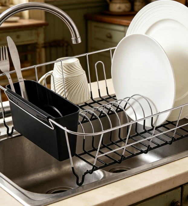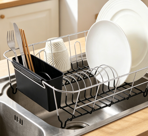 This compact countertop drying rack is designed for small kitchens and can hold plates and everyday cutlery. It includes a separate utensil holder for easy organization. The structure features a drainage system that channels water directly into the sink, effectively preventing water accumulation on the countertop.