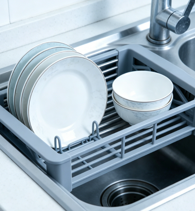 This countertop dish drainer rack is designed for small kitchens and can hold multiple plates and utensils. It includes a sloped drainage system that directs water into the sink and a detachable cutlery holder for organized storage.
