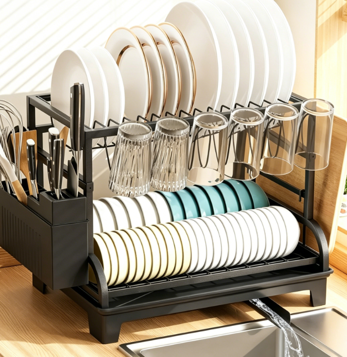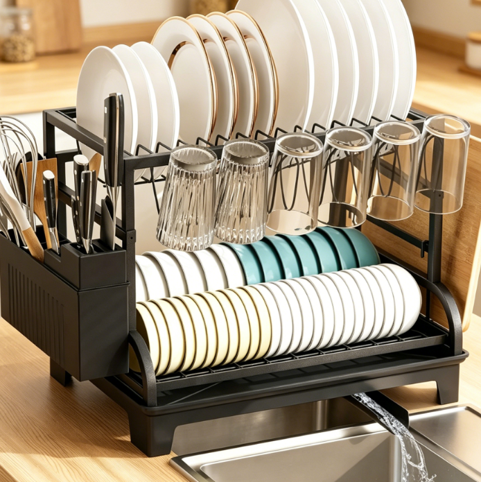 This double-tier dish rack features a layered design suitable for holding cutlery, bowls, plates, cups, and other items. It is equipped with a rotatable drainage spout and a centralized water-guiding mechanism, allowing water to drain directly into the sink and minimizing water accumulation on the countertop. The main body is constructed from stainless steel with a protective surface coating, ensuring structural stability and making it ideal for daily kitchen use. Assembly requires no tools, cleaning is simple, and the unit supports collapsible storage—making it an excellent choice for kitchens with limited space.