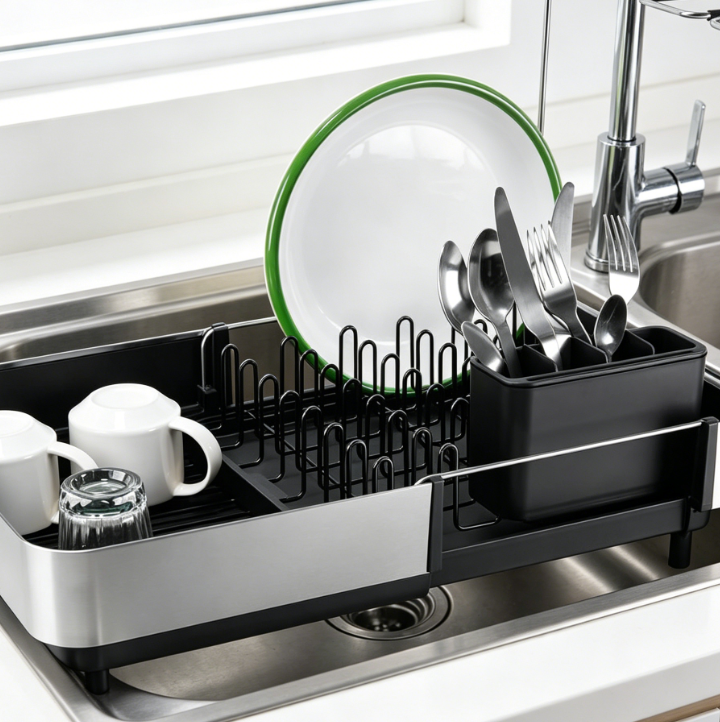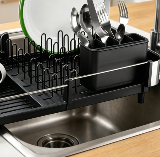This expandable sink drainer rack features a flexible capacity design, allowing you to increase storage space according to your specific needs. It is equipped with a collapsible bracket structure suitable for hanging cups or holding dinnerware. The unit has a total capacity for multiple dinnerware items and includes a dedicated utensil organizer to facilitate neat and categorized storage. The internal components feature a detachable design, making them easy to clean and organize. Constructed entirely from metal, the unit boasts a stable structure that is ideal for the daily draining and storage of kitchen dinnerware.