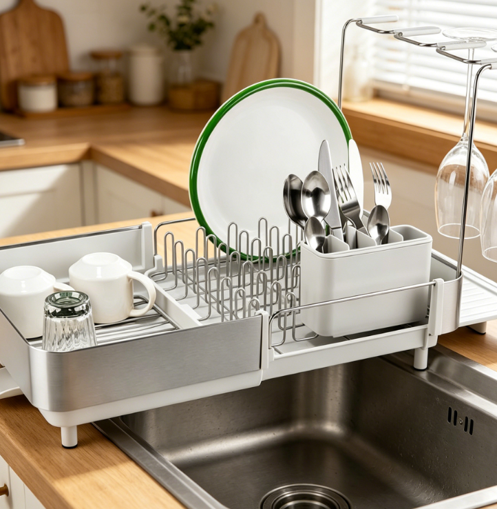 Expandable Dish Rack (with Wine Glass Rack and Drainage Spout) – Stainless Steel Design