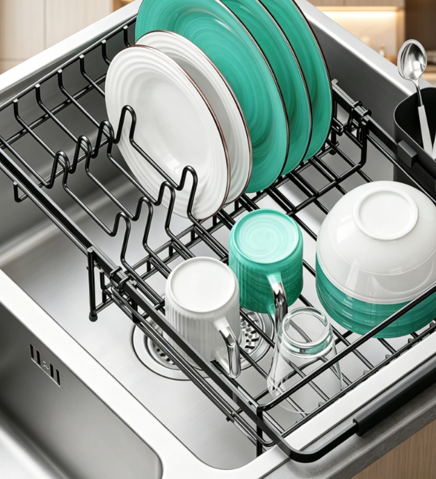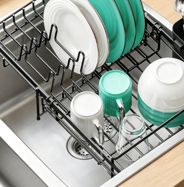 This high-capacity sink dish rack is designed for modern kitchen sinks and offers adjustable sizing. It provides stable support for dishes and kitchen tools and includes non-slip feet for secure placement. It is suitable for daily kitchen organization and draining tasks.