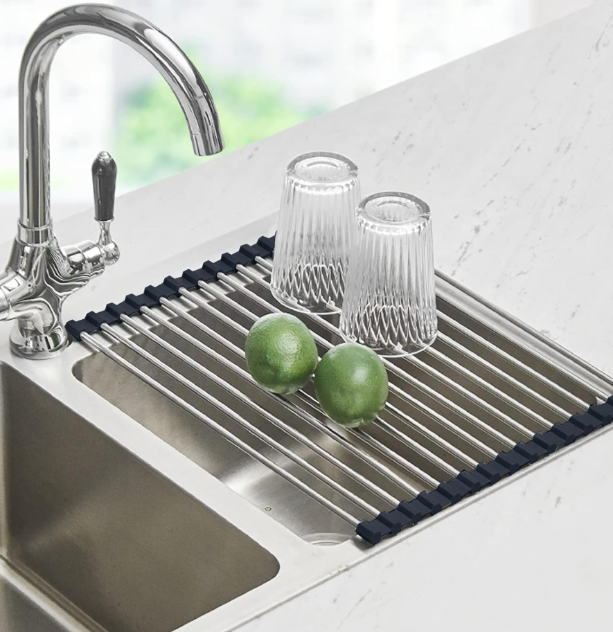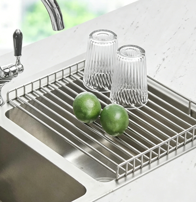 This expandable sink dish rack can be placed in or over the sink or on the countertop. It includes a removable plate rack and integrated handles for flexible organization of kitchen items such as plates, cups, fruits, and vegetables.