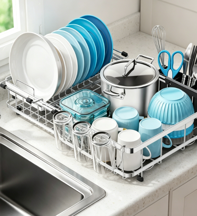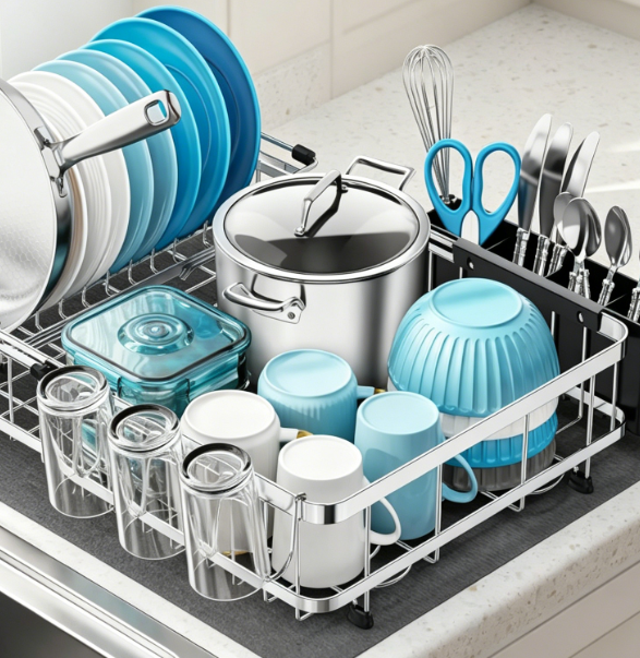 This double-tier stainless steel drying system consists of a detachable over-the-sink rack and a deep-capacity drying basket, which can be used together or separately as needed. When fully extended, it offers a generous drying area, ideal for holding a concentrated assortment of items such as pots, plates, and cutting boards. The rack can be positioned directly over the sink or stacked on the countertop. It features an absorbent mat designed to catch drips and prevent water from pooling on the counter surface. Constructed entirely from stainless steel, this unit is well-suited for the daily drying and organization of kitchen tableware.