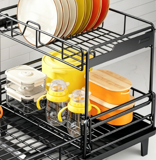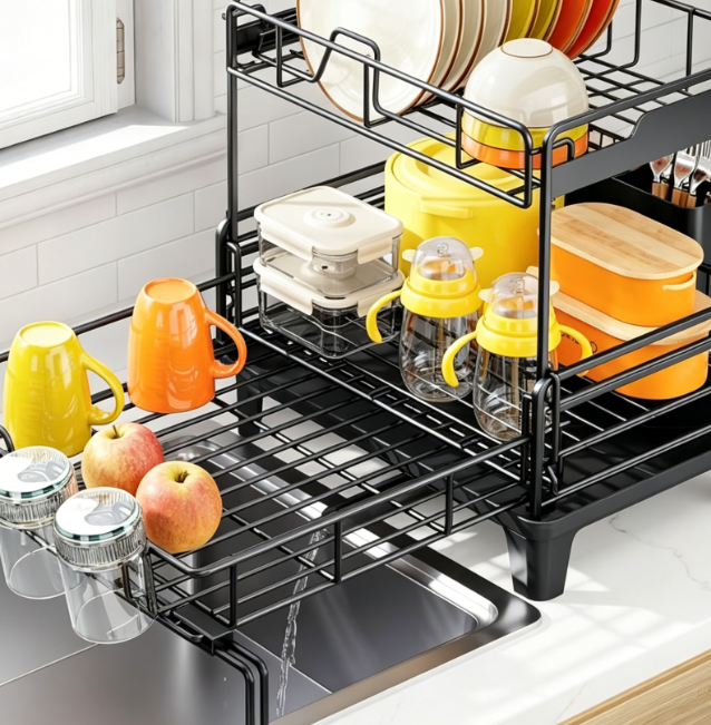This large-capacity, double-tier drying rack features a split-level design that allows for the simultaneous drying of plates, bowls, cups, and small pots. The rack’s length is adjustable to fit different sink dimensions, and sections of the unit can be positioned over the sink to free up valuable countertop space. The drainage tray features a directional flow design that channels water directly into the sink, minimizing residual water accumulation. Constructed entirely from stainless steel, the unit boasts a stable structure and is perfect for daily use in a home kitchen.