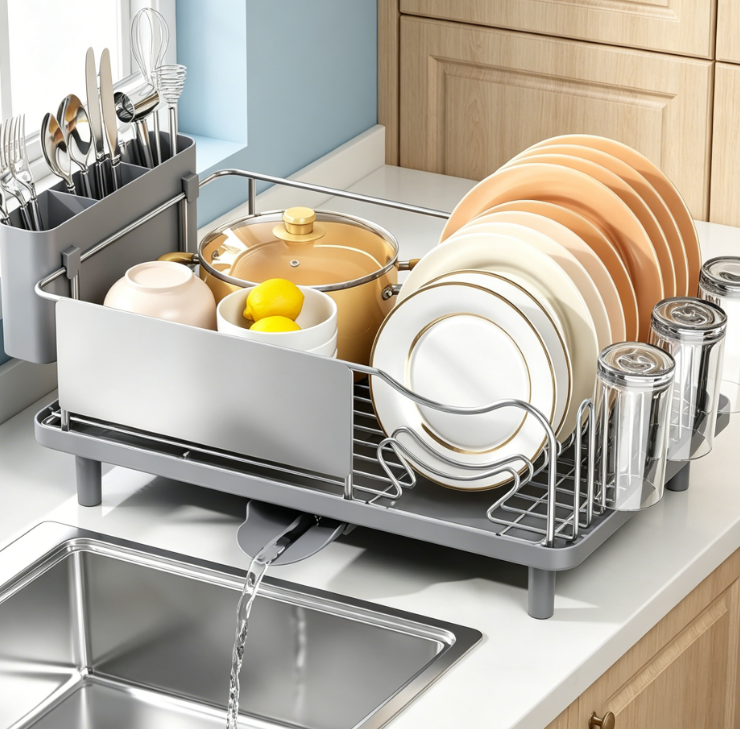High-Capacity Stainless Steel Dish Rack Set – Includes Drip Tray, Utensil Holder, and Cup Rack (Gray)