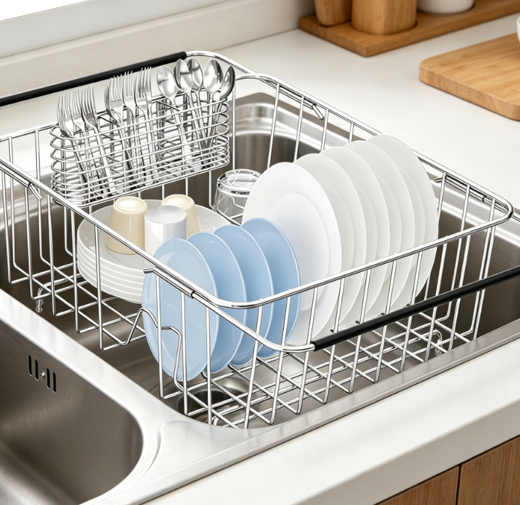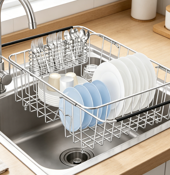 This stainless steel dish rack features an adjustable width, making it compatible with a wide range of sink sizes. It includes dedicated compartments for utensils and cutting boards, enabling the categorized storage of various kitchen tools while simplifying cleaning and maintenance.