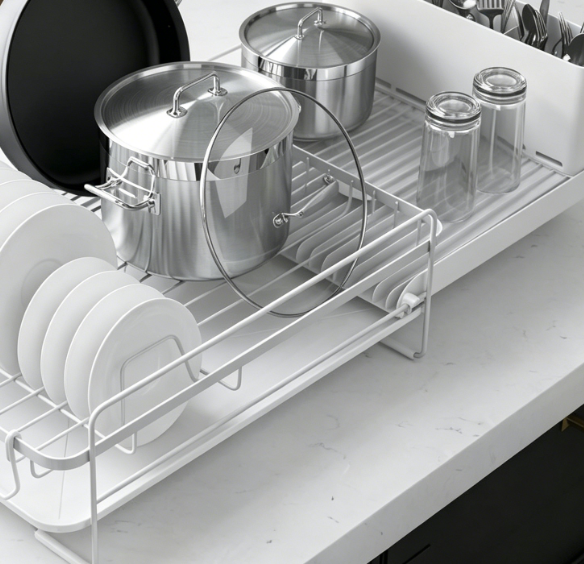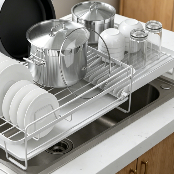 This expandable stainless steel drying rack is adaptable to various kitchen countertop layouts. The main body is constructed from rust-resistant coated stainless steel, ensuring structural stability and long-term durability. It features a partitioned design suitable for holding plates, cups, and cutlery. Equipped with an integrated drainage system, it directs water into the sink to prevent water from pooling on the countertop. Simple to assemble with no tools required, it is an excellent solution for daily kitchen organization and drying needs.
