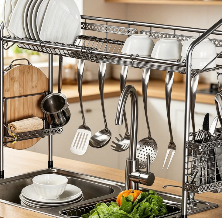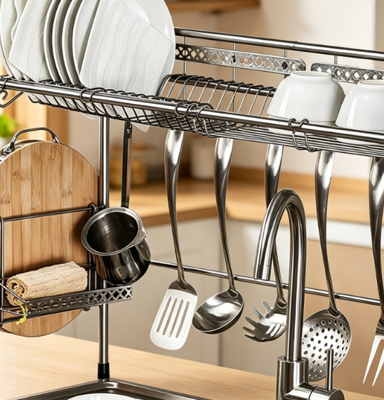 This over-the-sink dish rack features a stainless steel construction that is both sturdy and durable, making it ideal for the daily draining and storage of dishes, cookware, and various kitchen supplies. It mounts directly above the sink to effectively maximize countertop space.
