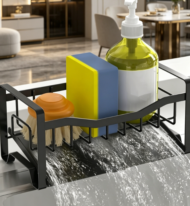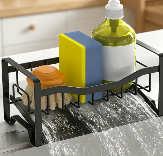 This compact dish rack is designed for households of one or two people or small kitchens. It includes slots for dinnerware and a detachable utensil holder. It features an adjustable support mechanism to adapt to different sink sizes, while the drainage system helps keep the countertop clean and dry.