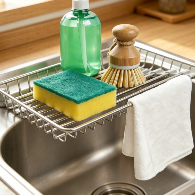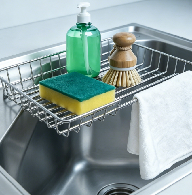 Triangular Corner Sink Dish Rack – Foldable Stainless Steel Corner Storage Basket (Includes Sponge Holder)